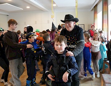 Am Rosenmontag trafen sich rund 60 Erstkommunionkinder und fleißige Helferinnen zur gemeinsamen Faschingsfeier im großen Saal des Pfarrheims. Mit „Helau“ und „Alaaf“ verwandelten sie den Raum kurzerhand in eine bunte Partyzone. Lustige Gruppenspiele, schwungvolle Tänze und fetzige Faschingsmusik von DJ Johannes, sorgten für beste Stimmung. Zwischen Luftschlangen, Luftballons und Girlanden wurde gehüpft, gesungen und herzhaft gelacht. Zur Stärkung gab es Wiener, Brezen und