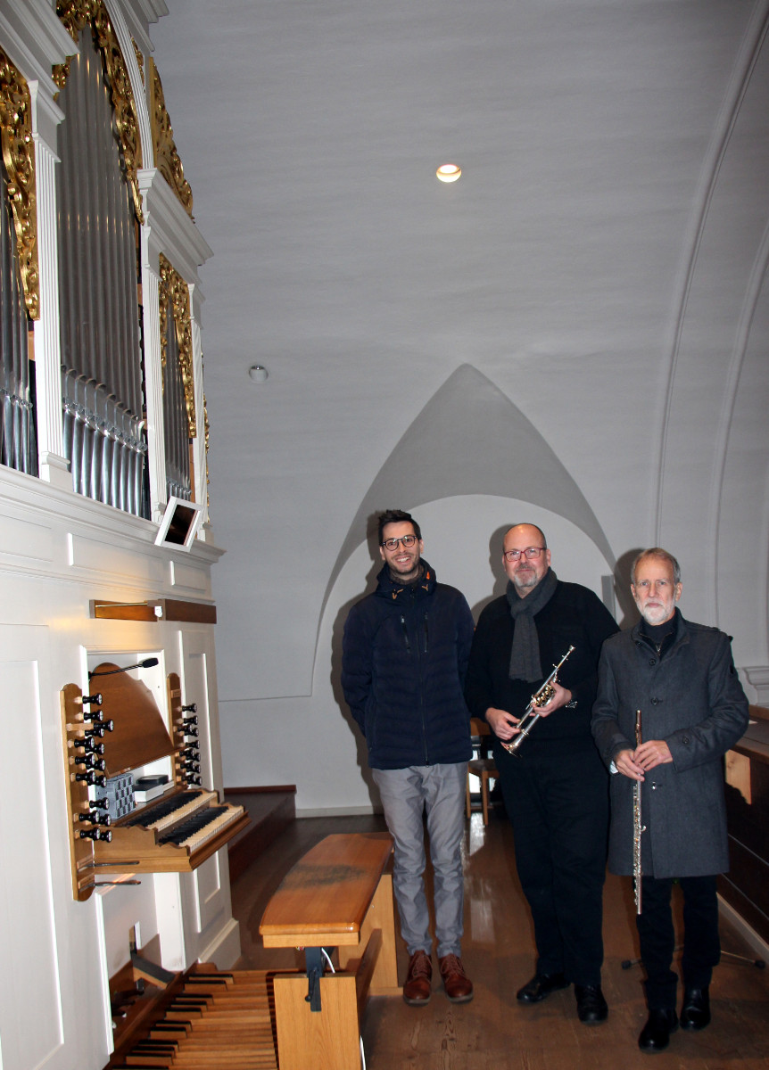 Den krönenden Abschluss bildete dann am Abend aber die musikalische Andacht, deren Gestaltung und Gesamtleitung erneut Kirchenmusiker Daniel Harlander innehatte. In einer festlichen Andacht mit abwechslungsreichen und einfühlsamen Melodien, zogen Matthias Schäffer an der Trompete und Dr. Erwin Müller mit der Querflöte zusammen mit Harlander an der Orgel die Zuhörer mit profunden musikalischen Kenntnissen in ihren Bann. Sie präsentierten Literatur von J.S. Bach, G.F. Händel, W.A. Mozart sowie Stücke von K. Badelt, J. Massenet, E. Morricone und sogar moderne Arrangements von Coldplay. Mit dieser Musikauswahl wurde eindeutig bewiesen, welche Bandbreite an Klängen eine Kirchenorgel bieten kann.