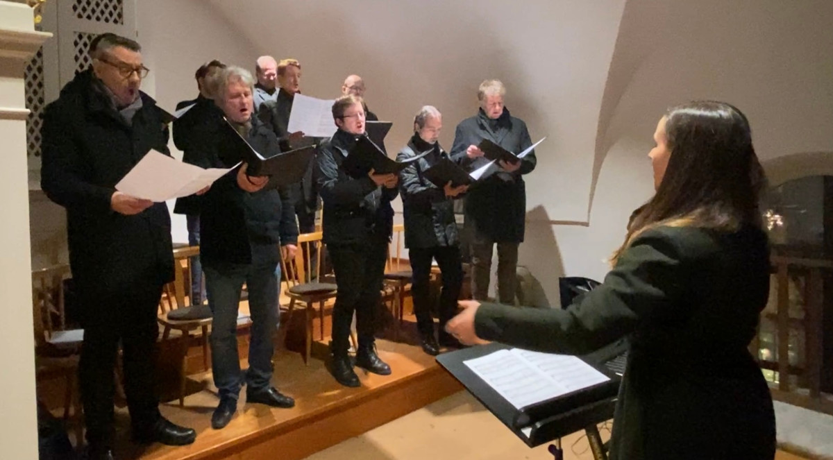 Die neun Männer trugen ihre vierstimmigen Werke auch a cappella vor. In der Roratemesse erklangen unter anderem „Seht, die gute Zeit ist nah“, aus der Messe nach Liedern der Weihnacht von Vinzenz Doering das „Kyrie“, „Sanctus“ und „Agnus Dei“ sowie zum Abschluss das beliebte Adventslied „Maria durch ein Dornwald ging“.