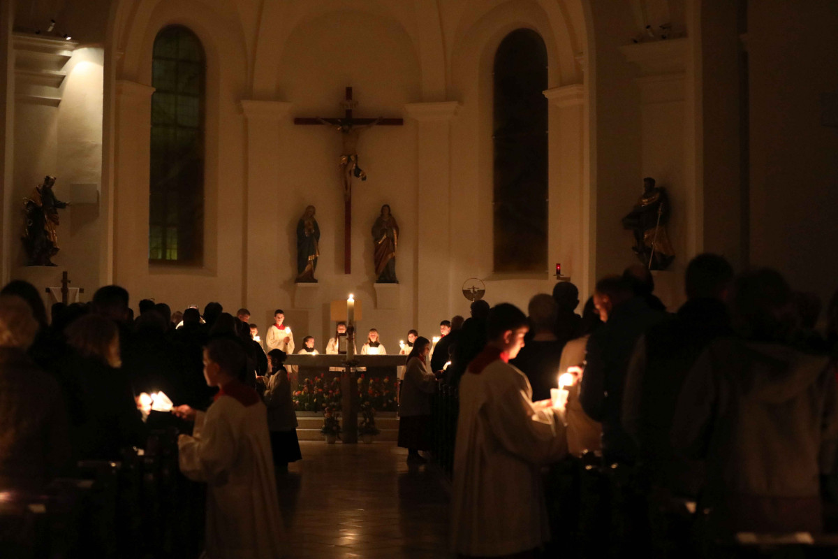 Nachdem BGR Pfarrer Stefan Anzinger zusammen mit über zwanzig Ministranten auf dem Kirchvorplatz das Osterfeuer gesegnet und das Licht an die kleinen Kerzen und Osterstumpen der Mitfeiernden weitergeben wurde, war das gesamte Gotteshaus in einen flackernd- warmen, heimeligen Kerzenschein eingetaucht.