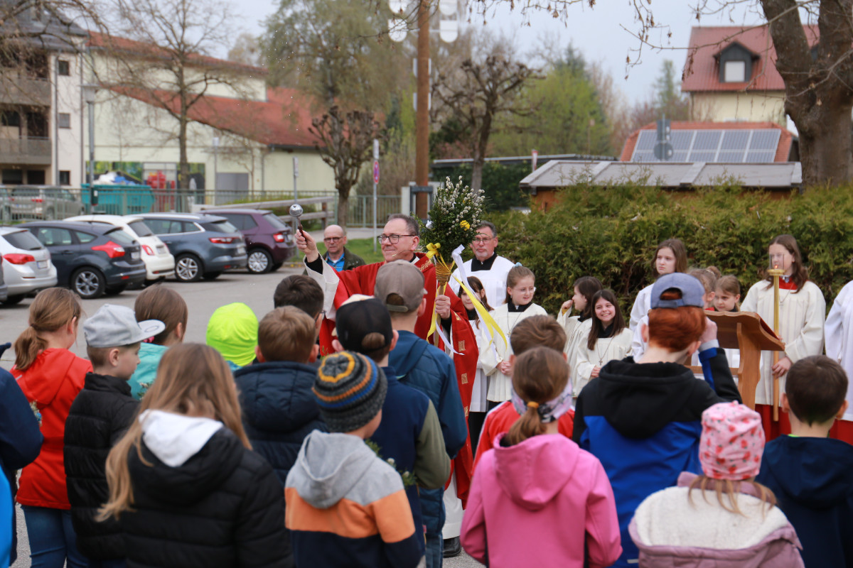 Am Palmsonntag fand wieder der traditionelle Stationsgottesdienst mit Palmweihe am Viehmarktplatz statt. Viele Kinder, Erstkommunionkinder, und eine beachtliche Zahl Gläubiger hatten sich eingefunden um mit BGR Pfarrer Stefan Anzinger und Pfarrvikar P. Anumon Va und den Ministranten Gottesdienst zu feiern.
