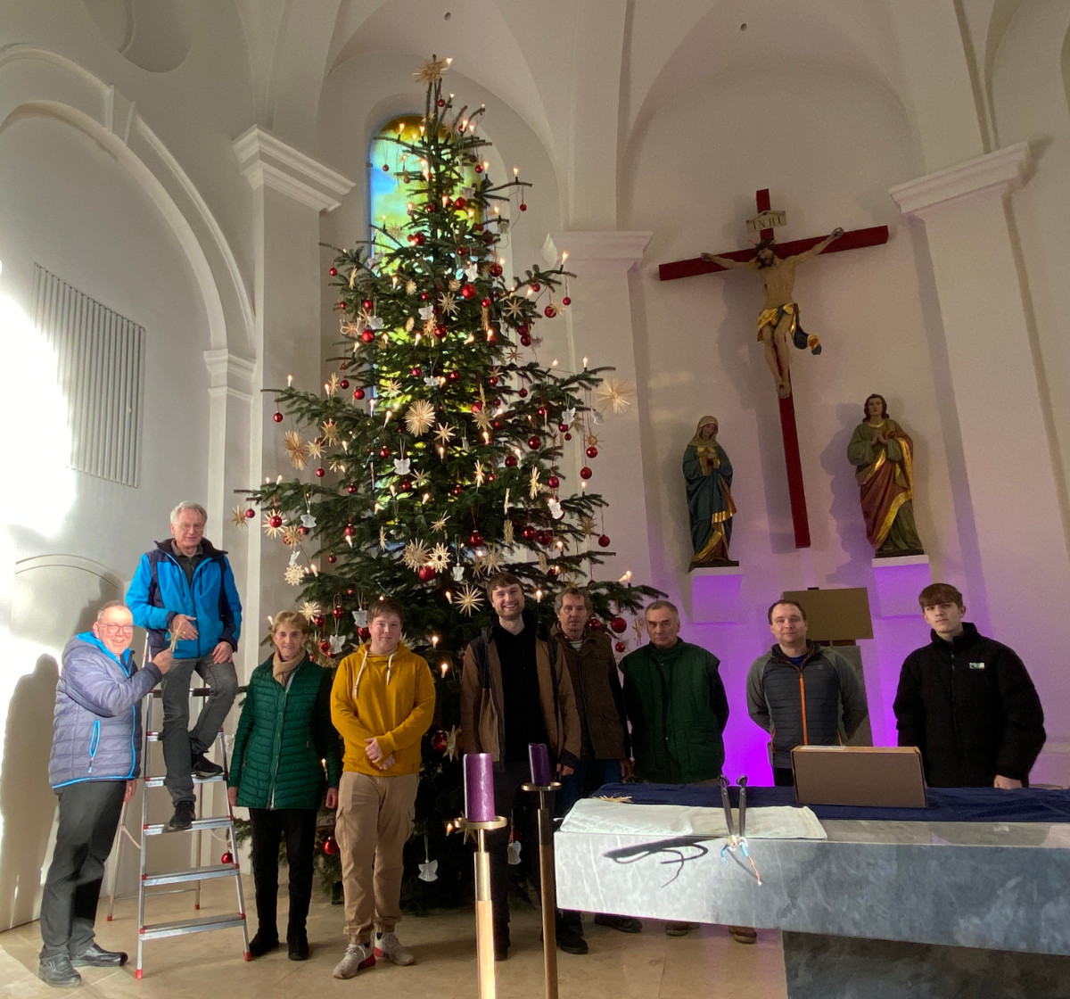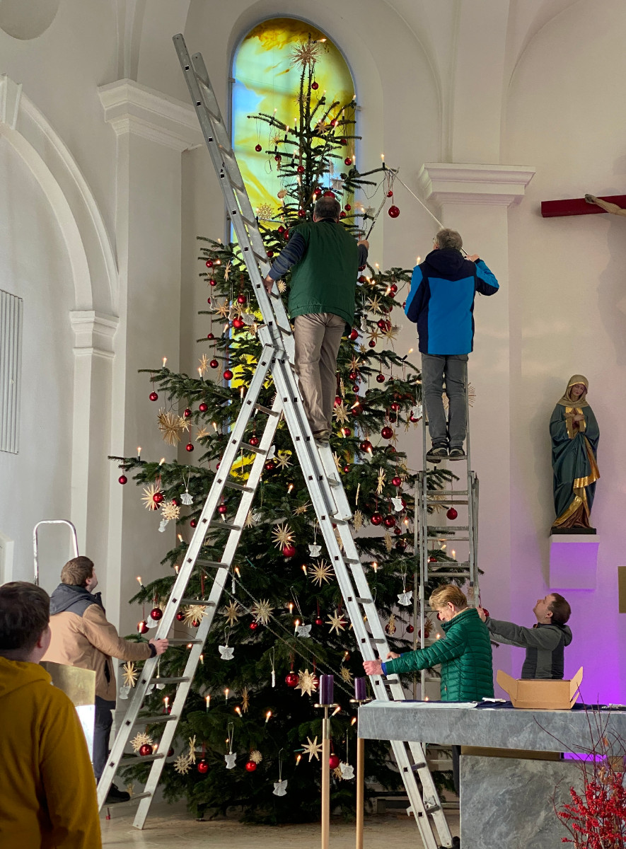 Wenn der mehr als 6 Meter hohe Baum in der Woche vor Weihnachten in die Kirche einzieht, verwandelt sich das Gotteshaus für einige Stunden in eine Werkstatt voller Leben. Männer, Frauen und Jugendliche aus der Pfarrei packen mit an: Der Bauhof der Marktgemeinde fällt und liefert die Tanne, zahlreiche ehrenamtliche Helfer richten sie im Kirchenraum auf – und erst dann beginnt das eigentliche Werk: das Schmücken.