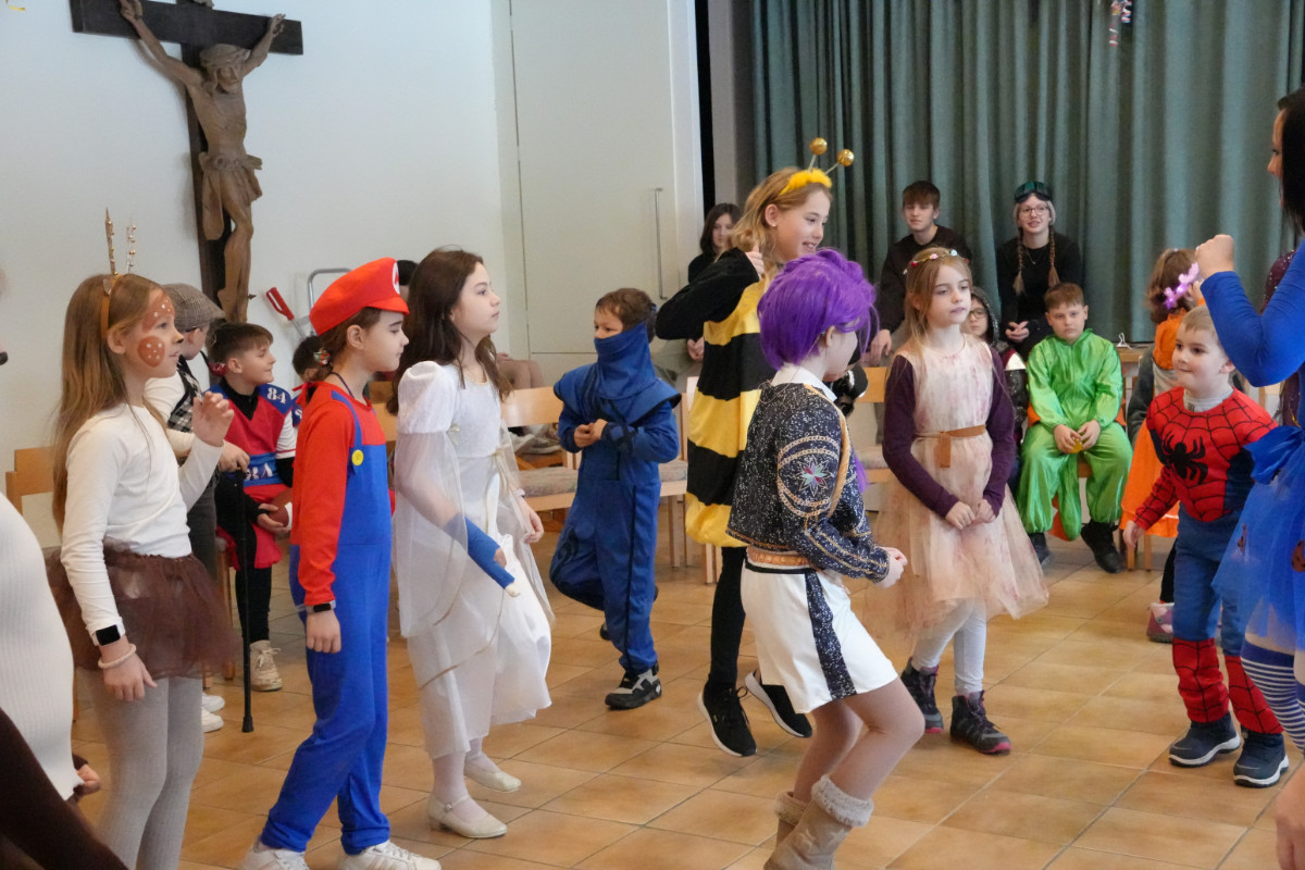 Am Rosenmontag trafen sich rund 60 Erstkommunionkinder und fleißige Helferinnen zur gemeinsamen Faschingsfeier im großen Saal des Pfarrheims. Mit „Helau“ und „Alaaf“ verwandelten sie den Raum kurzerhand in eine bunte Partyzone.
