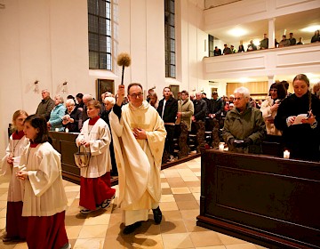 Mit einer lebendigen und feierlichen Liturgie begann am Palmsonntag in der Pfarrkirche St. Peter und Paul die Heilige Woche. Maria Weber gestaltete den Gottesdienst musikalisch an der Orgel. Im hinteren Teil der Kirche segneten Pfarrer Stefan Anzinger und Pfarrvikar Dominic Nelson Tawiah inmitten vieler Kinder die bunten, immergrünen Palmzweige der Gläubigen. Anschließend trug Pfarrer Anzinger das Evangelium vom Einzug Jesu in Jerusalem in kindgerechter Form vor. Die Passion wurde mit
