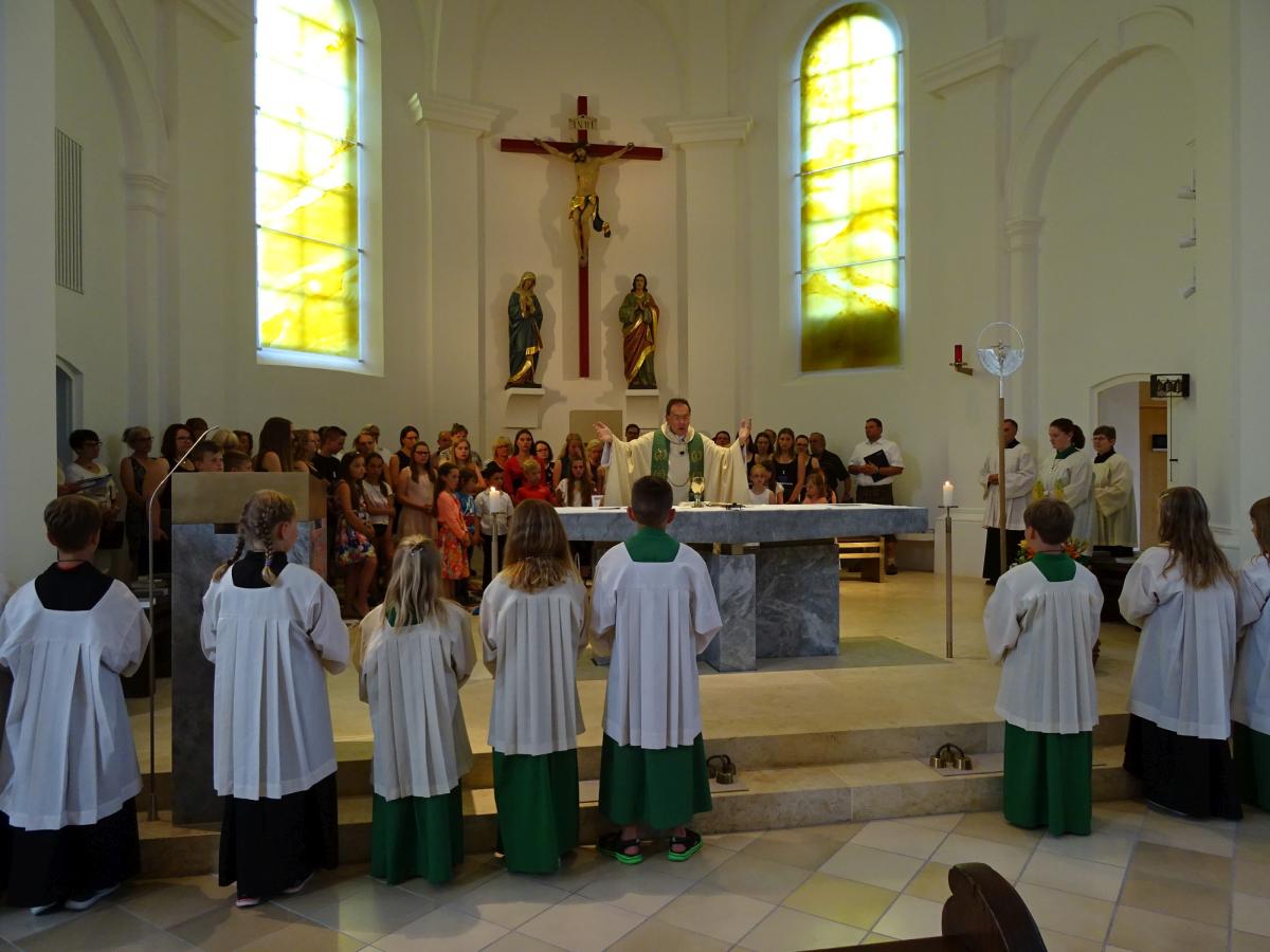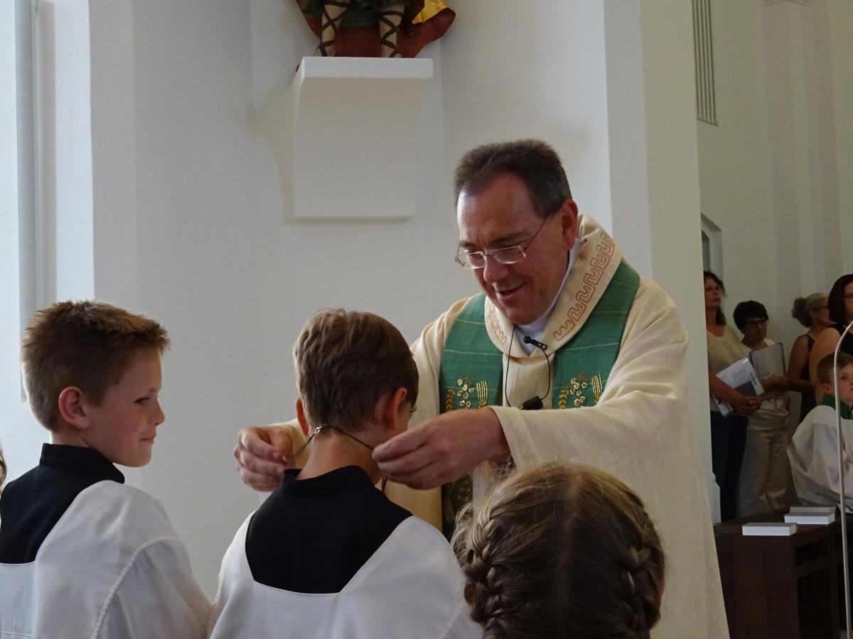 Zum Einstieg in die von Dekan Stefan Anzinger spontan ausgerufene „Peter und Paul-Woche“ in Ergoldsbach wurden beim fröhlichen Gottesdienst am Samstag (24.06.) 21 Ministranten und 24 Sängerinnen und Sänger offiziell in die Ministranten- und Chorgemeinschaft aufgenommen.