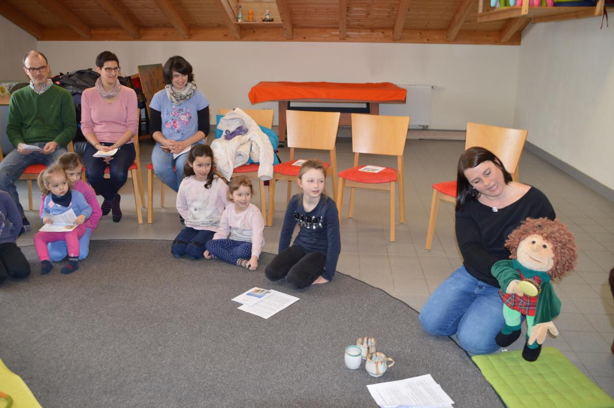 Zu Beginn war die Handpuppe "Luzie" zu besuch. Sie hatte einen Kamm dabei und machte sich besonders hübsch. Im Dialog mit Luzie arbeiteten wir heraus, warum sie sich so hübsch macht und auf welches besondere Fest sie wohl geht? Luzie machte sich für eine Hochzeit schick und so leiteten wir über, dass in der Bibel auch eine Geschichte erzählt wird, in der Jesus auf einer Hochzeit ist.