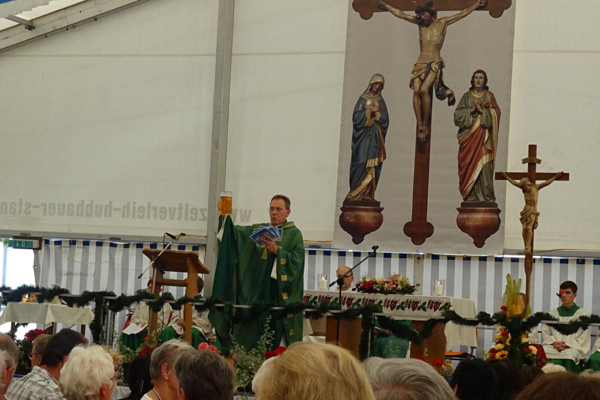 Locker und amüsant erklärte Dekan Stefan Anzinger in seiner Bierzeltpredigt anhand eines vollen Maßkrugs, was es mit dem „Schatz in einem zerbrechlichen Gefäß“, mit „der Verkündigung des Glaubens für uns angeschlagene und zerbrechliche Christen“ auf sich hat. Als er seine Ausführungen statt mit „Amen“ mit einem „Prost“ beendete, erhielt er spontan Applaus von den vielen Gottesdienstbesuchern, die er nach dem Schlusssegen mit einem Blick zur Schänke und Bierzeltküche einlud: „Bleibt in Frieden noch hier!“