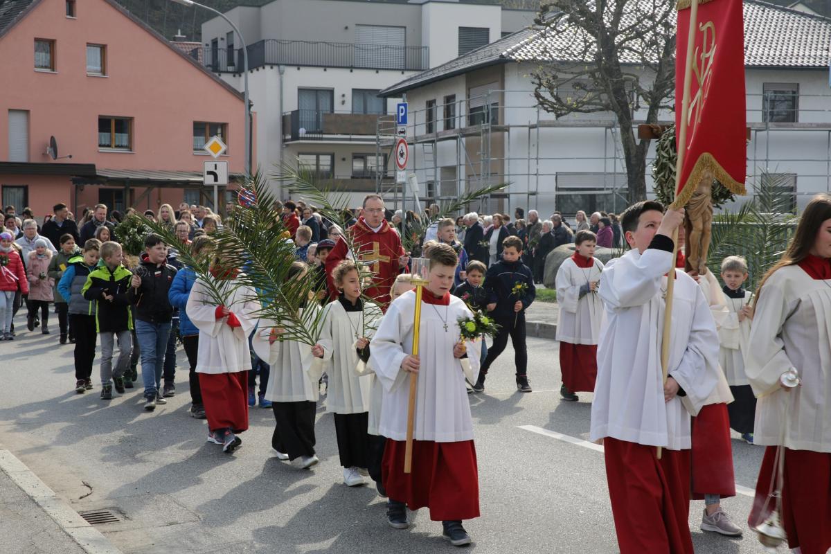Wie beim Einzug Jesu in Jerusalem vor 2000 Jahren waren am Palmsonntag (14.04.) in Ergoldsbach viele Gottesdienstbesucher, darunter erfreulich viele Kinder und Jugendliche bei der Palmweihe am Viehmarktplatz mit dabei und jubelten mit ihren bunten, herrlich geschmückten Palmbüscheln „Hosanna, dem Sohne Davids“. Anschließend zogen die Ministranten, Dekan Stefan Anzinger und die Gottesdienstgemeinde in einer langen Prozession zur Pfarrkirche, wo sie die Leidensgeschichte hörten und Eucharistie feierten. Besonderes Gepräge erhielt der Familiengottesdienst durch die fröhlichen, aber auch nachdenklichen Lieder der Peter und Paul Spatzen.