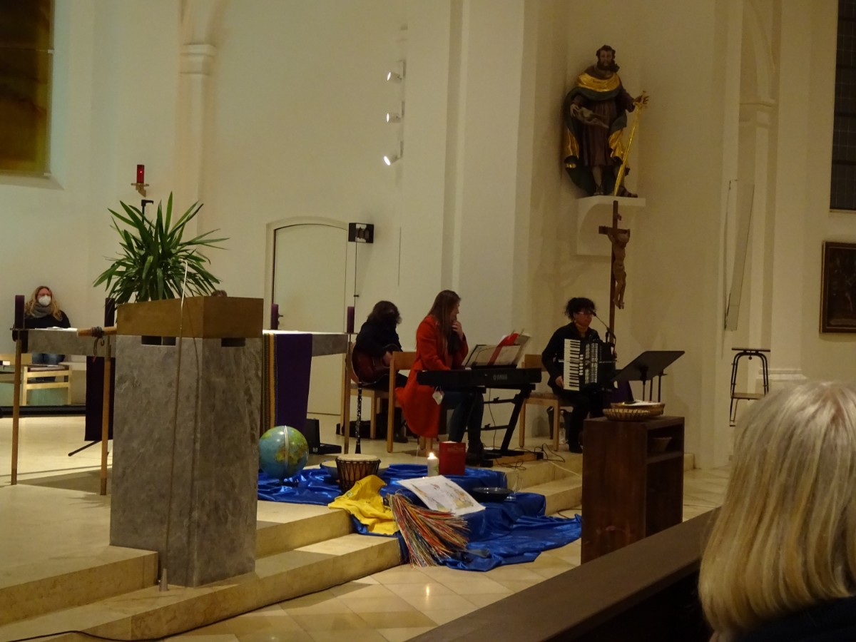 Nachdem Frauen das vermeintlich am Ende der Welt liegende Land vorgestellt und dazu passend einen Globus und eine Landkarte, Sand symbolisch für die landestypischen Sandbilder und kostbares Trinkwasser, dazu Musikinstrumente und Kleidung sowie eine Bibel, die in Vanuatu in die über einhundert Landessprachen übersetzt ist, zum Altar gebracht hatten, dankten sie Gott und baten ihn um Vergebung. Dabei nahmen die Texte immer wieder Bezug auf das Leitthema des Weltgebetstages 2021: „Worauf bauen wir? Was trägt unser Leben, wenn alles ins Wanken gerät?“
