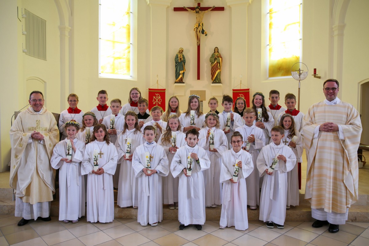 Obwohl es für Pfarrer Stefan Anzinger, Kaplan Henrik Preuß und Religionslehrerin Anna-Maria Seidl bereits der vierte Erstkommuniongottesdienst dieses Jahres war, erlebten auch sie die Feier wieder ganz individuell: „Die Kinder waren super drauf und haben gut mitgemacht. Das stimmt uns zuversichtlich, da können wir auf eine Fortsetzung des Glaubensweges der Kinder und Eltern hoffen!“ An den Beginn des Glaubensweges erinnerte die Erneuerung des Taufversprechens. Mit ihren brennenden Kommunionkerzen in den Händen bestätigten die Buben und Mädchen kräftig: „Ich glaube!“