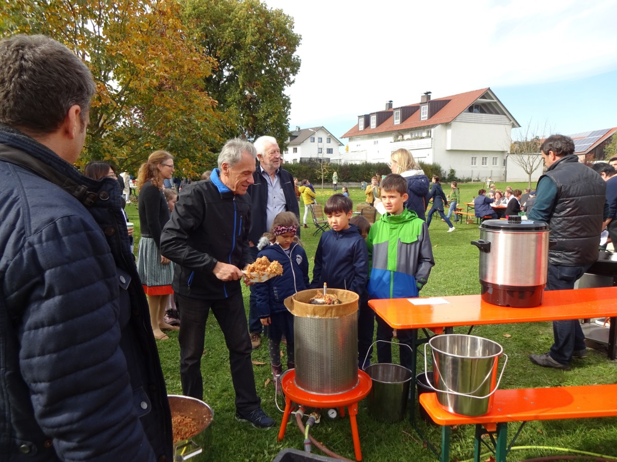 Nach dem Erntedankgottesdienst erfreuten sich vor allem die Kinder an Gottes schöner Natur, spielten, bastelten und malten im Pfarrgarten, balancierten über die Slackline, rutschten auf Tragerl talwärts und malten ihre Ideen für eine neue Kinderkirchen-Fahne. Neu und spannend war für viele, wie schnell man aus Äpfeln Apfelsaft pressen kann und wie lecker der schmeckt. Geschmeckt hat auch das Essensangebot des Frauenbundes: fleißige Helfer verwöhnten die kleinen und großen Gäste mit Deftigem und Süßem – und mit Apfelkiachal frisch aus der Pfanne.