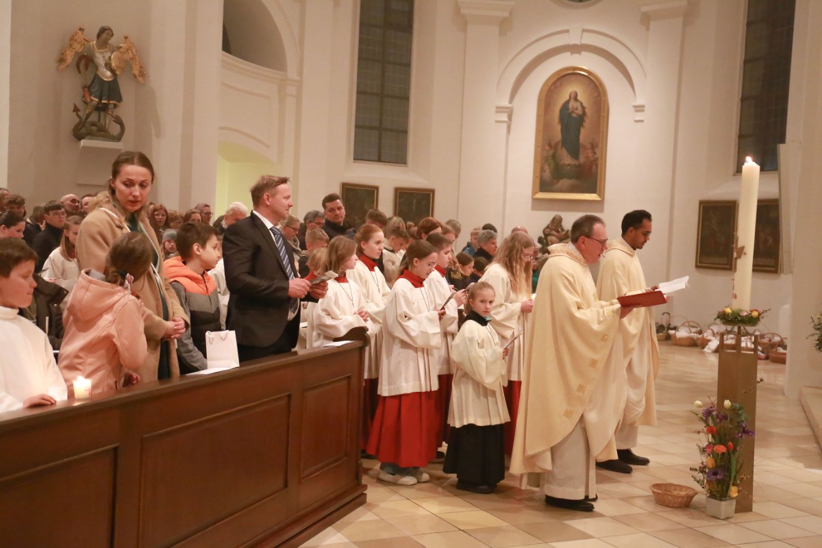 Die feierliche Osternachtsliturgie begann Bischöflich Geistlicher Rat Pfarrer Stefan Anzinger dieses Jahr wieder traditionell mit der Segnung des Osterfeuers am Kirchplatz. Die daran entzündete Osterkerze, die der Geistliche zusammen mit Pfarrvikar P. Anumon Va und seinen vielen Ministranten danach in das Gotteshaus trug, erhellte dieses schlagartig. Zum »Lumen Christi« und »Deo gratias« Gesang beim Einzug, schenkten die Ministranten dann das Licht der Osternacht an die Gläubigen weiter und schon bald erstrahlte die zuvor dunkle Pfarrkirche im warmen, weichen Kerzenschein.