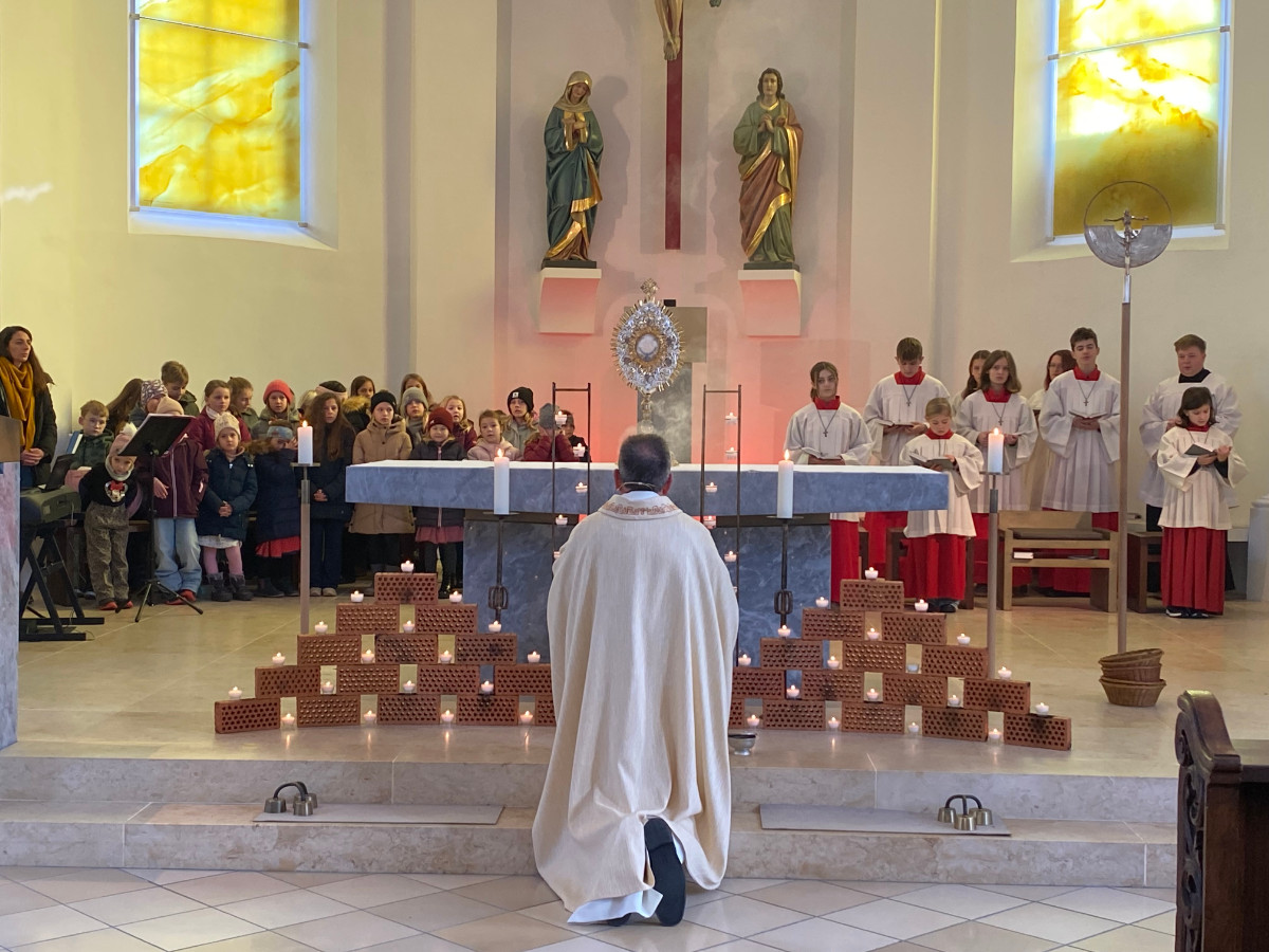 Der Christkönigssonntag, der in Ergoldsbach traditionell im Zeichen der Ewigen Anbetung steht, wurde heuer besonders festlich begangen: Bereits der Gottesdienst um 10 Uhr war ein Höhepunkt: Die zahlreichen Mädchen und Buben des Kinderchors der Pfarrei Ergoldsbach unter der Leitung von Ilona Weber begeisterten die Gemeinde mit schwungvollen Liedern und spürbarem Engagement. Nach dem Aussetzen des Allerheiligsten in der Monstranz, bestand den ganzen Tag die Möglichkeit zum stillen Gebet. Am Nachmittag versammelten sich viele Erstkommunionkinder der Pfarreiengemeinschaft zu einer kindgerecht gestalteten „Prayer Hour“ in der Pfarrkirche zusammen. Dort lernten sie auf anschauliche Weise verschiedene Formen der Anbetung kennen – begleitet von Gebeten, Liedern und reger Beteiligung.