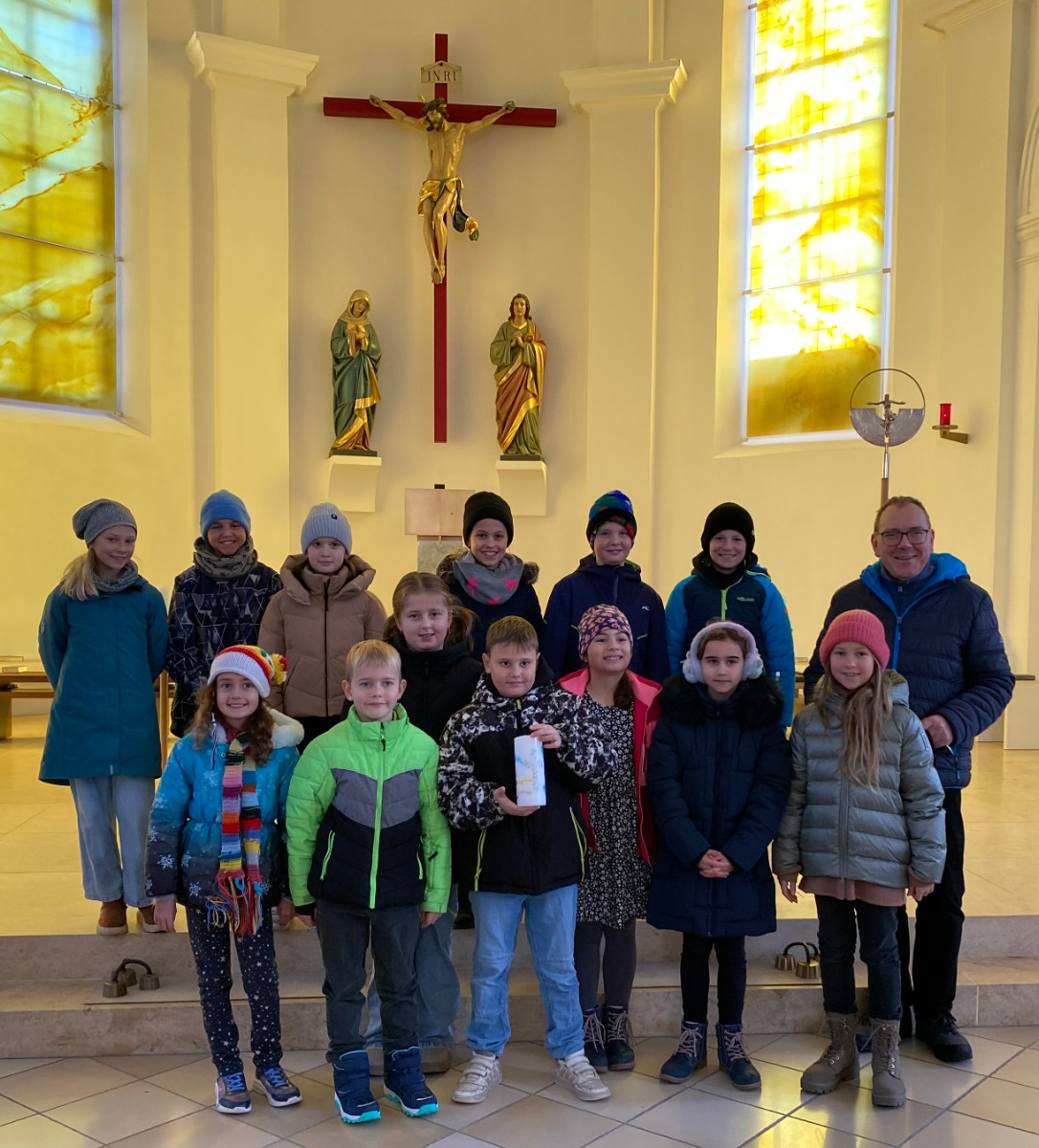 Nach einem gemeinsamen Gruppenfoto dankten die Kinder und ihre Tischmütter dem Pfarrer mit einer kleinen Aufmerksamkeit für zwei unterhaltsame und lehrreiche Stunden.