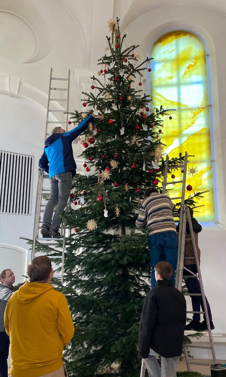 Wenn der mehr als 6 Meter hohe Baum in der Woche vor Weihnachten in die Kirche einzieht, verwandelt sich das Gotteshaus für einige Stunden in eine Werkstatt voller Leben. Männer, Frauen und Jugendliche aus der Pfarrei packen mit an: Der Bauhof der Marktgemeinde fällt und liefert die Tanne, zahlreiche ehrenamtliche Helfer richten sie im Kirchenraum auf – und erst dann beginnt das eigentliche Werk: das Schmücken.