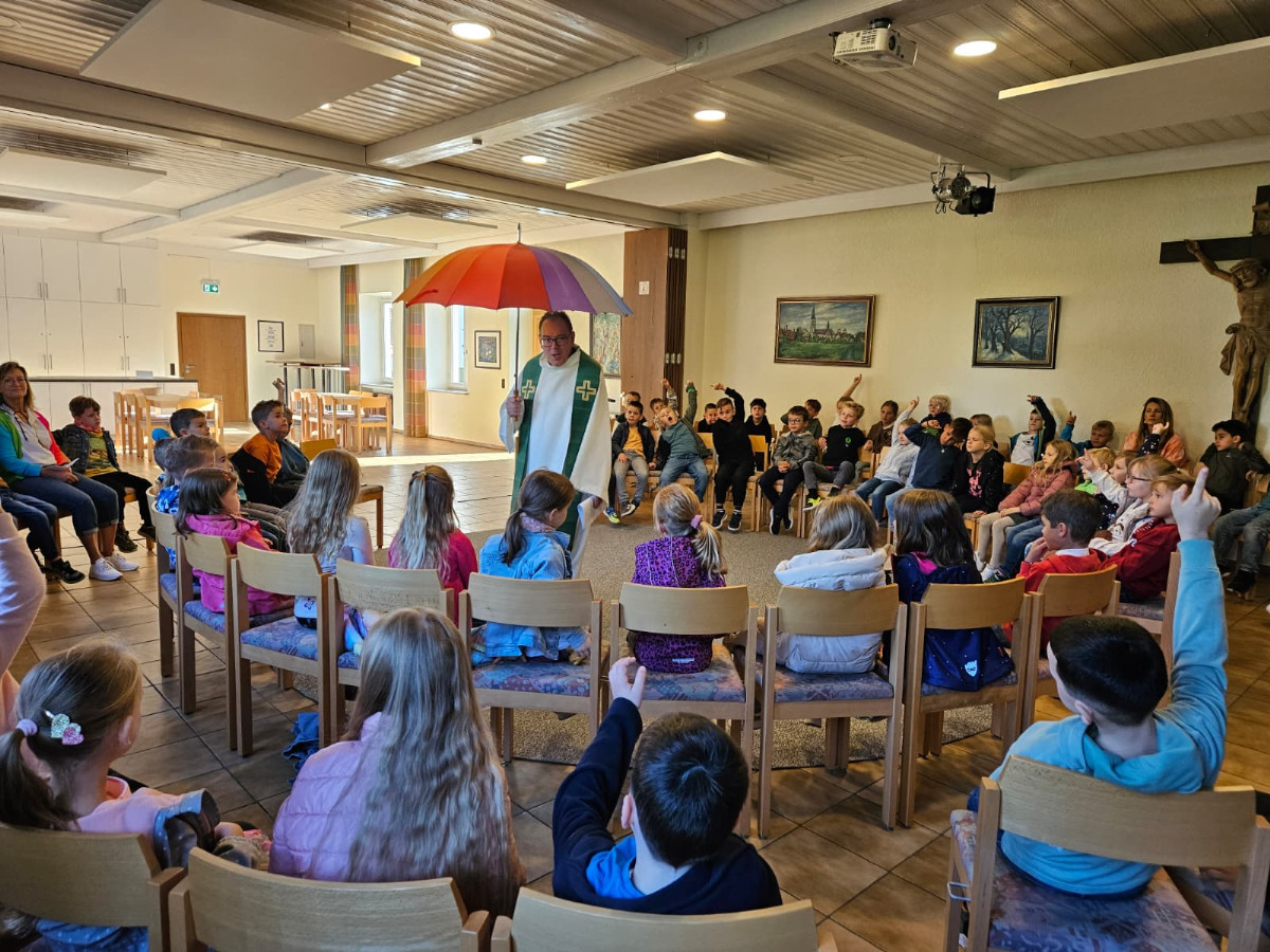 Um diese Aussage spürbar zu machen, lud Pfarrer Anzinger die Kinder ein, nach vorne zu kommen, um unter dem regenbogenfarbenen Schirm Schutz und Geborgenheit zu erfahren.