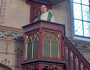 Bei der Freiluft-Messfeier am Viehmarktplatz, die, genau wie die Prozession, eine Bläsergruppe der Roßbachtaler Blasmusik begleitete, erklärte